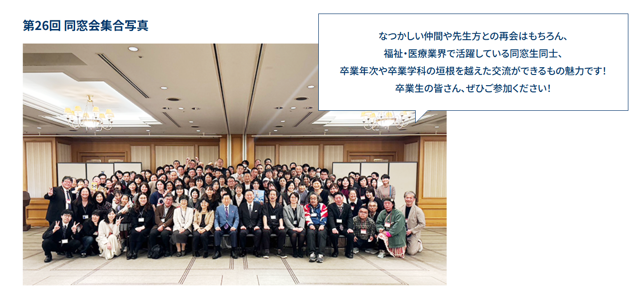 また、卒業生同士、福祉・医療業界で活躍する者同士、情報交換やネットワークを広げる場として活用していただいております。詳細は同窓会SNSをご確認ください。広がり続ける日福の同窓会ネットワークに、ぜひ、クラスメイト・サークルメンバーと一緒に、ご参加ください!!(当日は名刺をお持ちください。)