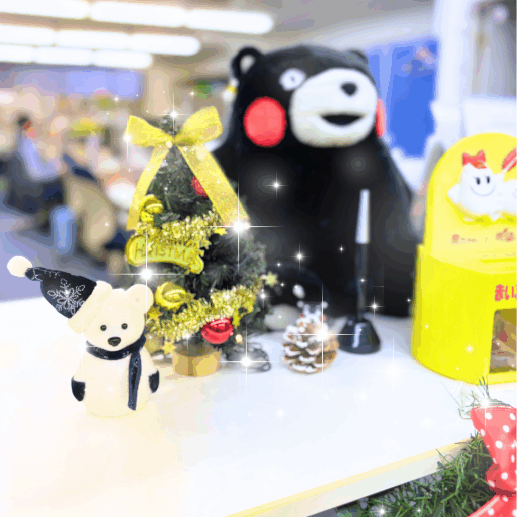 受付にいるくまモンのそばには、小さなくまと小さなツリーを設置しました。