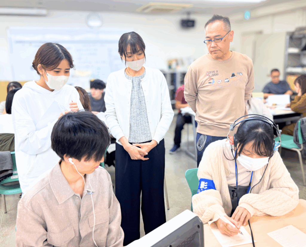 ヘッドホンを装着し、音声に耳を澄ませて書き取る学生の姿や、検査機器の設定・確認を丁寧に行う様子、ペア同士で声を交わしながら進める場面など、真剣に学ぶ姿が随所に見られました。