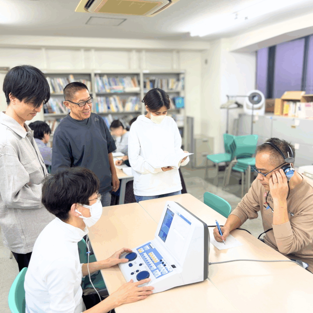 静かな実習室でヘッドホンから流れる数字や単音節の音声を集中して聞き取り、用紙へ聞こえた通りに書き取る――学生たちは真剣な表情で取り組み、検査の奥深さを実感している様子でした。