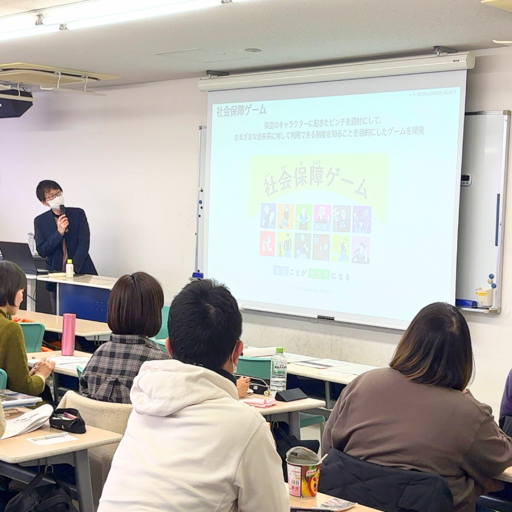授業では、横山様が開発に関わっている「社会保障ゲーム」について紹介がありました。
