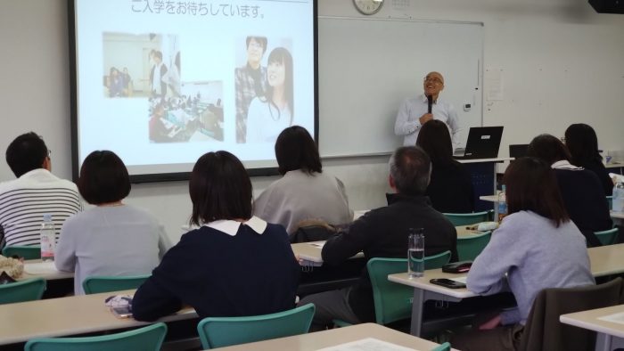 当日は、昼間部学科長の秋山先生と夜間部学科長の片桐先生が登壇し、入学後の学びや社会福祉士としてのキャリアについてお話されました。